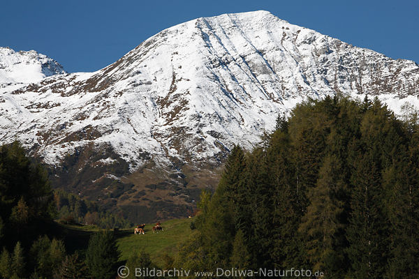 Alps summit Bergerkogel panorama in the snow over grazing cows photo on green mountain-meadow Osttirols. Austria Alps-landscape nature-picture, Berger-Kogel 2656m pikes winter-landscape photography, over traveling-paradise Virgental photo from Obermauern