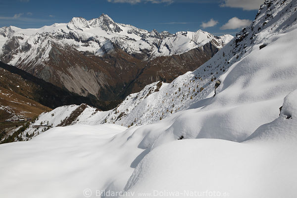 Berghütte auf 2207m Seehöhe links unten im Bild vom Wandern in Alpen Berglandschaft unter weissen Schneedecke mit grandiosem Blick auf höchsten Berg Österreichs am Nationalpark Hohe Tauern