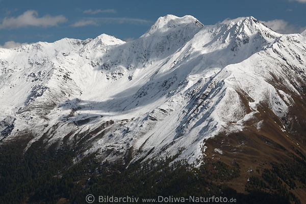 Österreich Bergspitzen Fotografie winterliches Bergblick auf Berghänge Hohen Tauern mit kleinen Berghütte rechts unten an Waldgrenze
