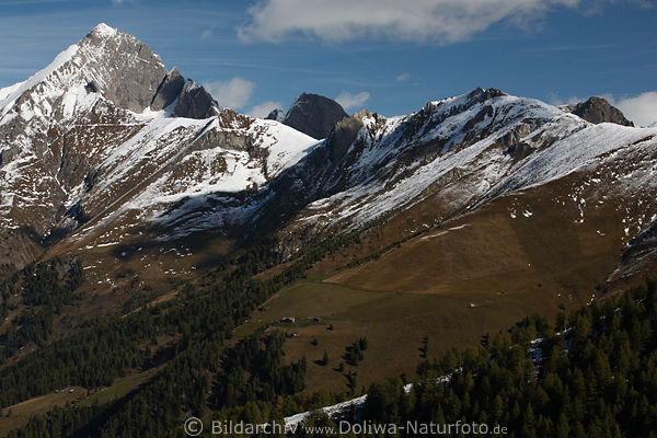 Kendlspitze ist mit 3088 m Seehöhe höchster Berg über Matrei in Osttirol. Alpengipfel im Schnee, Naturlandschaft Panorama Fotografie über noch grüne bewaldete Hänge des Metreier Talkessels. Österreich Nationalpark Hohe Tauern Gipfel am Großglockner Resort und Goldried Skigebiet