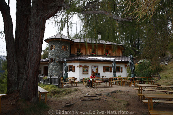Aussen ein Schlösschen Innen urig & niedlich eingerichtet bietet die Stabanthütte: Gaststube für Wanderer + Bergsteiger Unterkunft Übernachtung-Zimmer für 16 Personen in Ferienwohnung + Zweibettzimmer (inkl. Frühstück ca.16,80 Euro) für Erholung in luftiger Höhe auf fast 1800 m inmitten Natur des Bichlerwaldes in Osttirols Virgental über Prägraten. Österreich Wanderparadies Hohe Tauern grüne Oase in Berglandschaft am Adlerweg. Dabei ist die Parkmöglichkeit im Ortsteil Prägraten-Bichl in 1490 m Höhe.