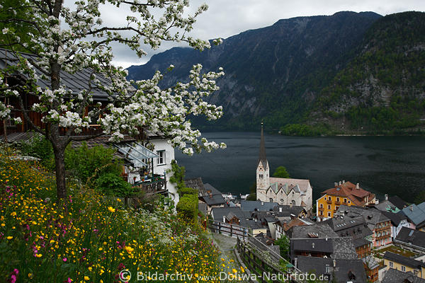 Hallstatt fruit tree springbloom Austria Alpslake romantic travel hit photo world heritage mountainscity image colorful meadow flowers in Alps nature landscape