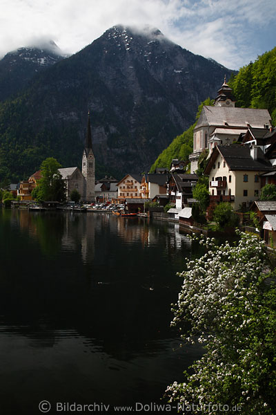 Österreich schöne Reise Urlaubsausflug zur seit 1997 UNESCO Weltkulturerbestadt Hallstatt Reisebild in grüner Berglandschaft: Bürgerhäuser und zwei Kirchen über Schiffsanlegestelle (für Rundreise auf fjordenartigen Hallstätter See), Bootshäuser wie Pension & Hotels am Wasserufer der uralten Salzbergstadt mit Wandertips für Naturliebhaber, Museen für Fans der 7000 Jahre alten Stadtgeschichte und Salzwelten Sehenswürdigkeiten