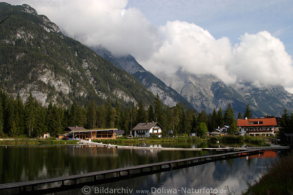 Österreich Alpen Berglandschaft am Seewasser, Stimmung am See mit Holzsteg, Leutasch-Oberweidach Naturbild am Bergsee in ca. 1100 m ü.M. Tirol Landschaftsbild aus Bergland Nordtirols, Häuser unter Bergen in Wolken, Urlaubsregion Fotografie südlich Wettersteingebirge Natur Ausflugstipp