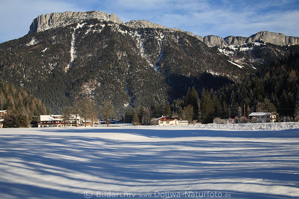 Österreich Alpenlandschaft Winterbild vom Tiroler Berg mit 1869 m Seehöhe über beliebten Reiseort für Bergurlaub in Schnee mit Schatten der Bäume in Sonnenschein