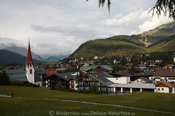 Bergstadt im Tal unterhalb Bergwiese Bilder, Österreich Urlaub im Skigebiet & Natur der Bergen, Ferienregion Urlaubsstadt südlich von Mittenwald (D) und nördlich Innsbruck, Alpen Bergland Landschaftsbilder, Bergurlaub Fotografie mit Reiselust