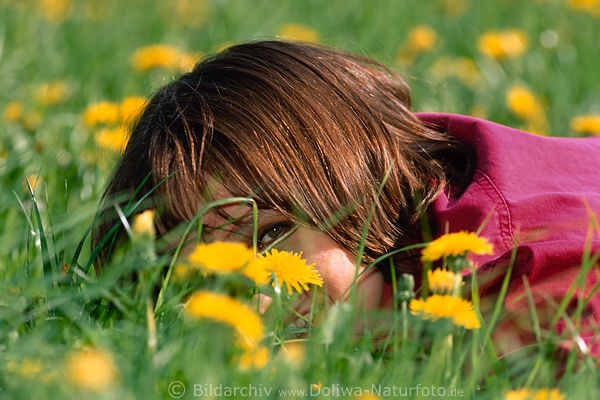 3691. Girl in gras green meadow blossom flowers relaxen in spring, hide-and-seek game, young women picture in sun enjoy, nature fun, joy |