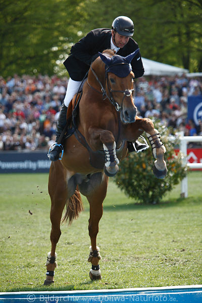 Hurdles jumping dynamic portrait on horse before water high-climbs to jump effective image championship competition photography as exklusive print