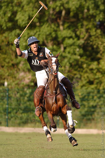 Poloplayer gallop scream horse-rider emotions photo action super-image polo-game pictures of Juan Manuel Echeverz to horse after goal-shot Polostar by High Goal Championship tournament by Rolex Crown Cup
